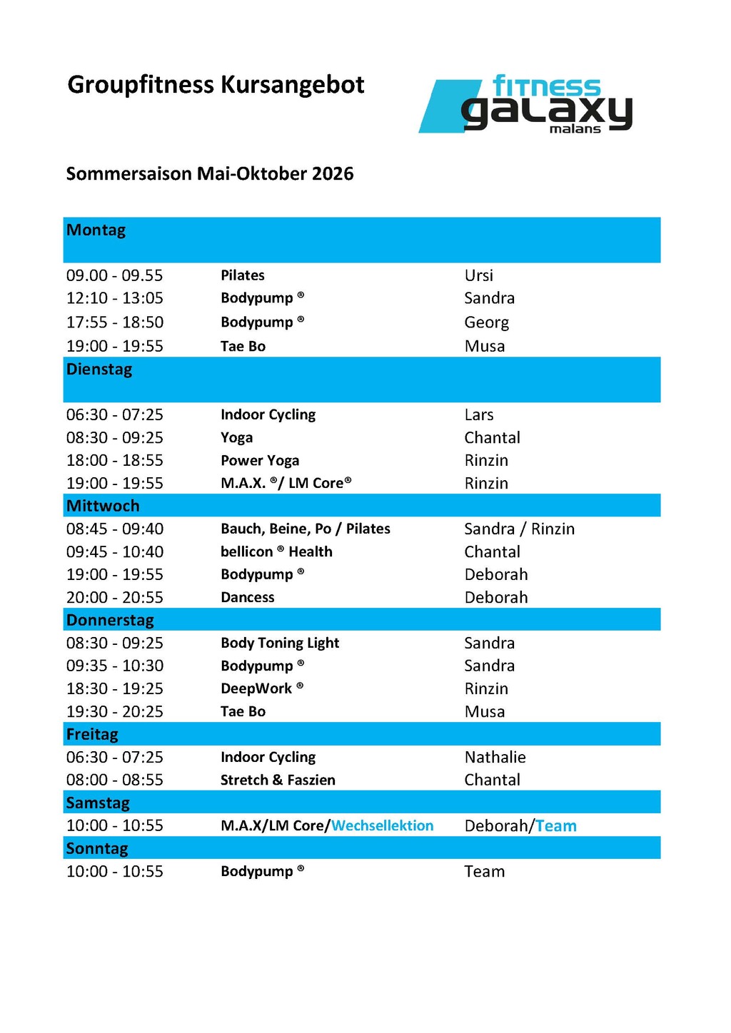 Folgende Groupfitness Lektionen führen wir von Mai bis Oktober 2026 durch.